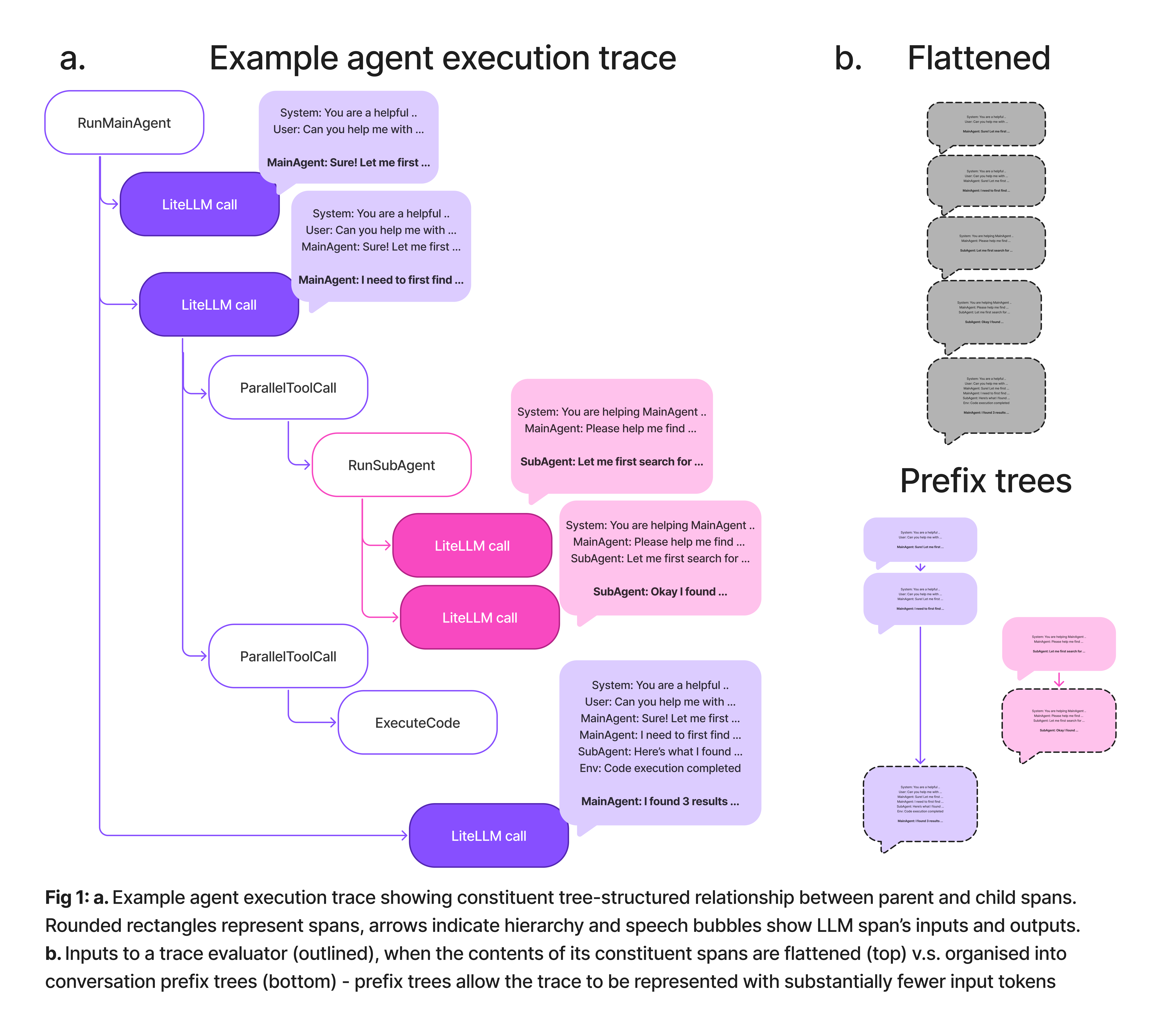 Smartly ingesting this structure lets us represent the trace much more compactly, as a collection of conversation prefix trees, related to each other through span parent-child relationships. For example, in the trace above there are 5 LLM spans that we could evaluate, each with its own conversation history - but only 2 growing prefix trees, one for each agent! This compact representation is much more token efficient, and lets us take advantage of prefix caching in the evaluator LLM, in a way that stuffing the flattened trace with each span’s inputs would not.