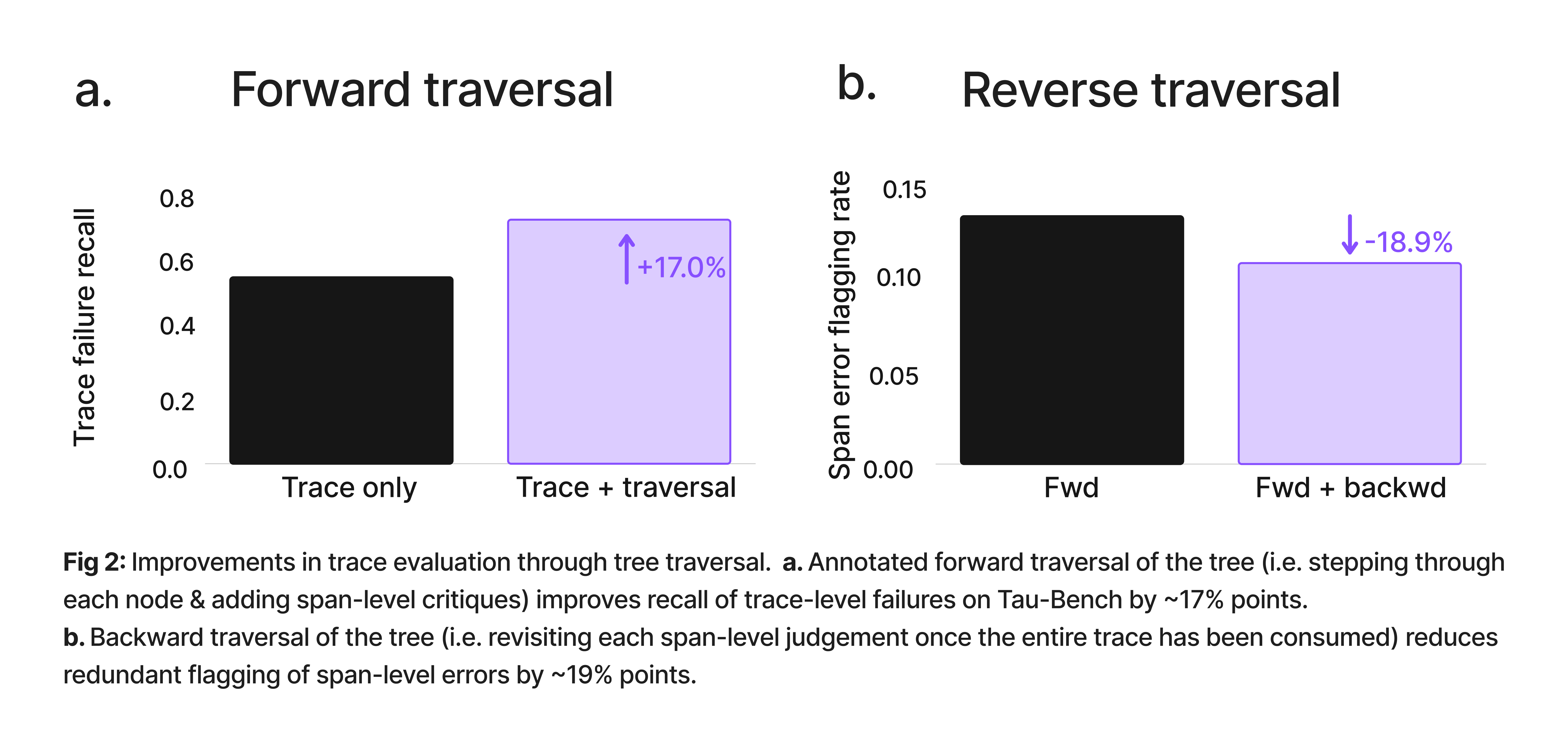 We compared this “traversal” style evaluation, with added notes at each node, with a vanilla evaluation that simply consumes the entire trace at once. In both cases we attempted to predict whether the trace was a failure or not on traces from the Tau Bench benchmark (where we have ground truth labels of trace failure). We found that annotated traversal boosts recall of trace failure by ~17% points [1], even when using the exact same long context LLM to predict failure.