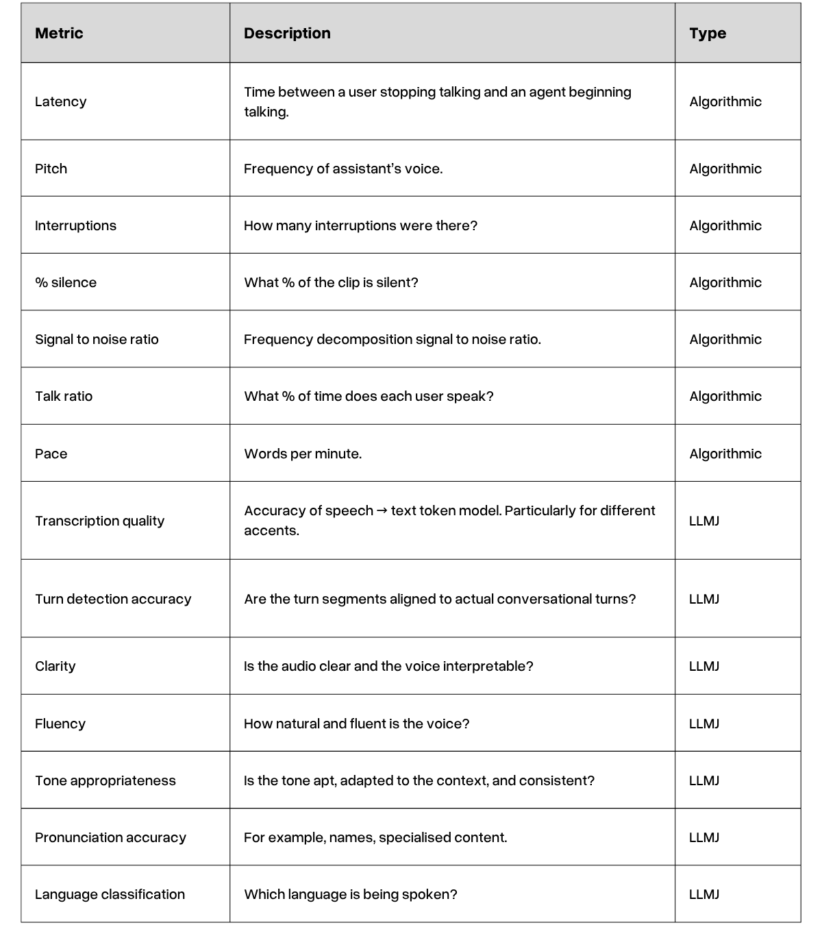 - Algorithmic metrics: Use a deterministic algorithm applied to the audio data. This alone does not provide the necessary actionable insights about where/why an agent deviated from its ruleset to perform error analysis. Aggregation would be required to obtain some overarching information about a system’s health.
